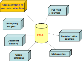 Among the secondary objectives: support to cataloging of documents, the production of full text portals of the SciELO type and bibliometric studies. Products and services generated in SeCS can also be linked to other applications, such as update alert services (new acquisitions), on demand document delivery, lending systems, publications exchange, etc