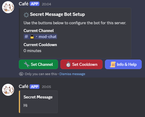 /setupcommand that provides buttons, dropdowns, and modals for effortless configuration. - 🔧 Fully Configurable — Set the destination channel and user cooldown duration.