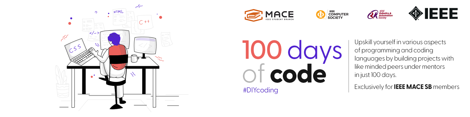 A mutual initiative of IEEE CS SBC MACE and IEEE RAS SBC MACE aiming to promote DIY a.k.a Do-It-Yourself Coding, upskill yourself in various aspects of programming and coding languages by building projects with like minded peers under mentors in the next 100 days.