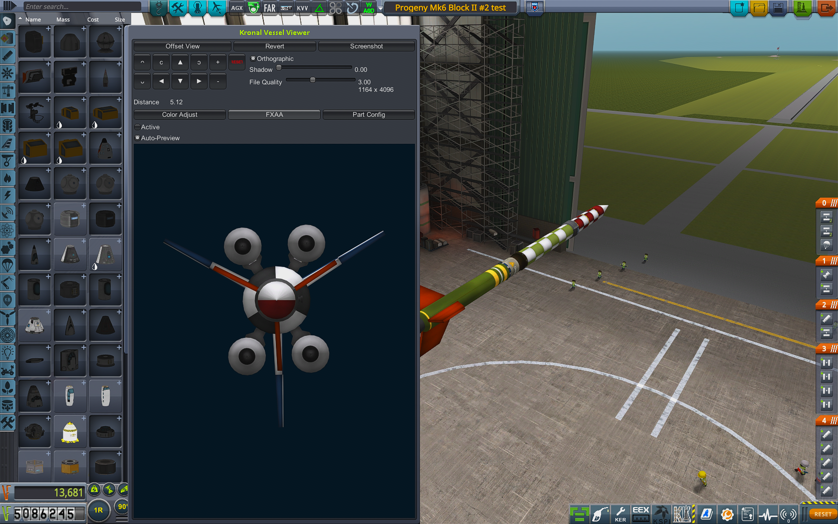 Okay now go ahead and press that Screenshot button at the top-right of the KVV window and check your /Screenshots folder in your KSP installation. Because you adjusted the view around it's possible the screenshot didn't capture the whole rocket and your scale part. If not, use the arrow/zoom keys to adjust the view accordingly and keep trying until you get everything in the screenshot. Here's mine: