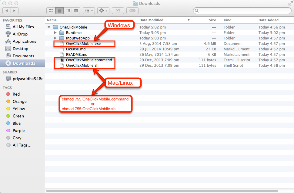 - Use the Terminal program in Mac/Linux to change mode the OneClickMobile.command file to have execute permission (chmod 755 OneClickMobile.command)