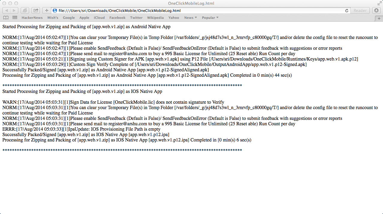 </li> <li> Run OneClickMobile.exe in Windows or OneClickMobile.command or OneClickMobile.sh in Mac/Linux </li> </ul </li> <li> Expected Result: <ul> <li> IOS Output Directory having a <strong>app.web.v1.ipa</strong> files with corresponding install batch files </li> <li> Log File : <strong>OneClickMobileLog.html</strong> </li> </ul </li>
