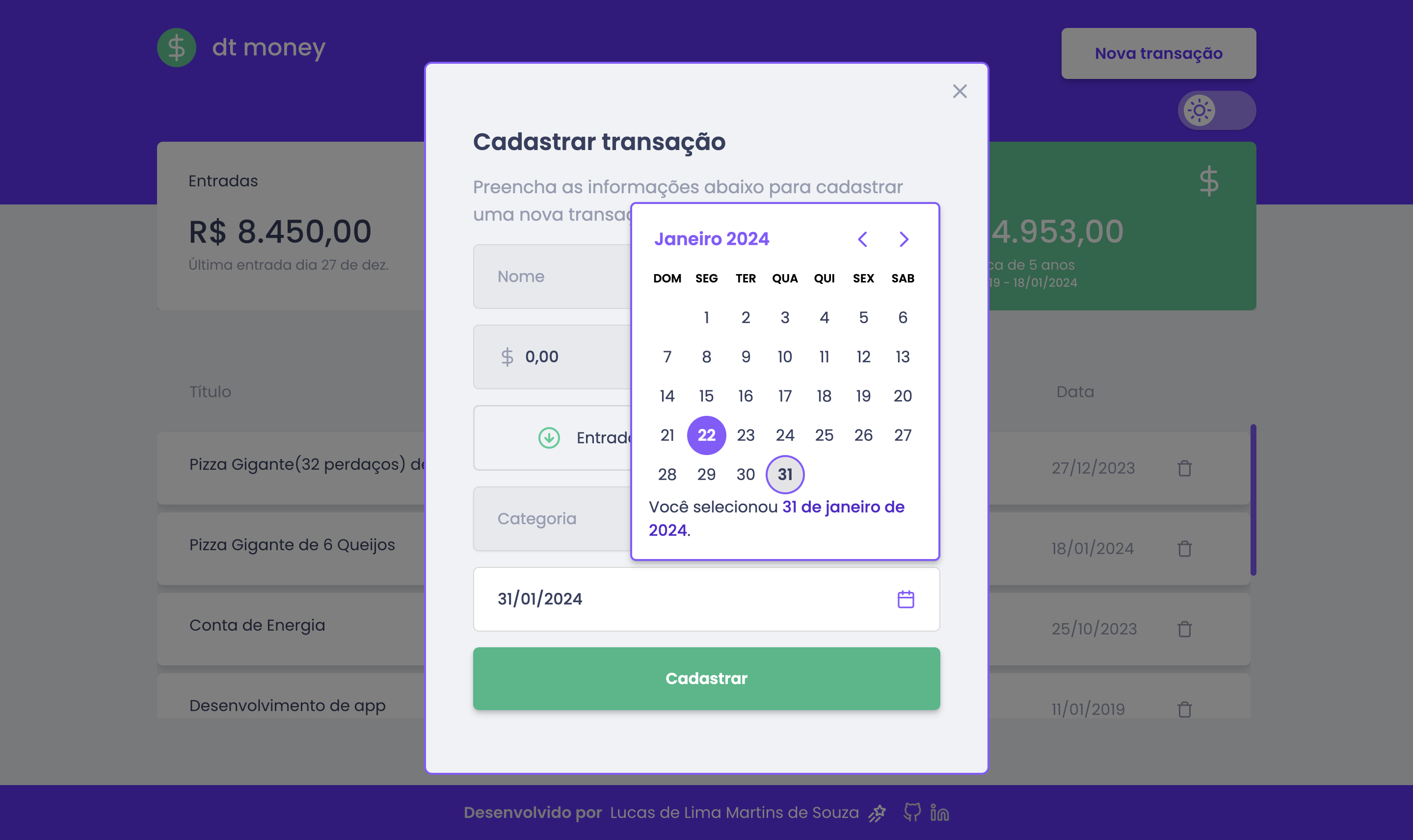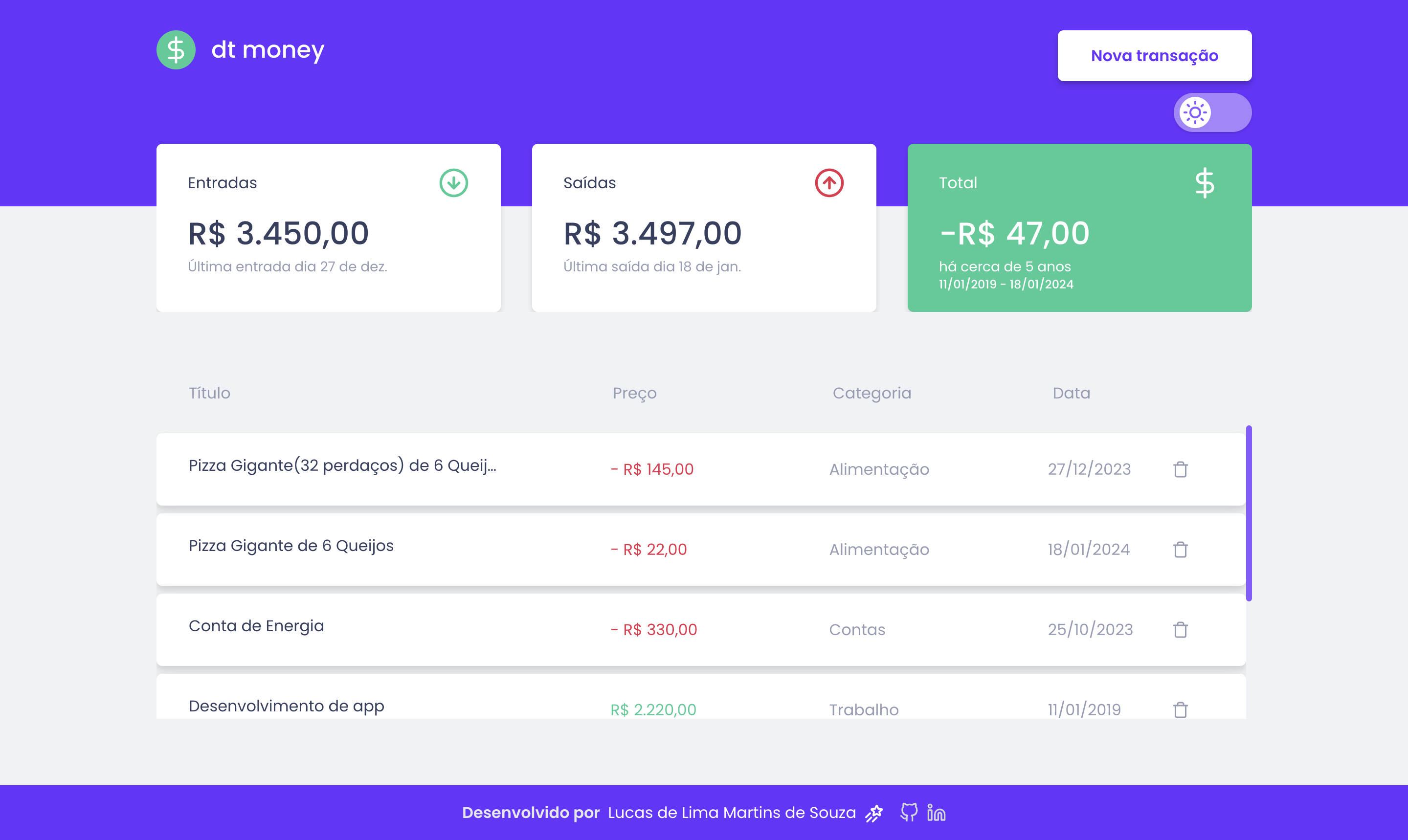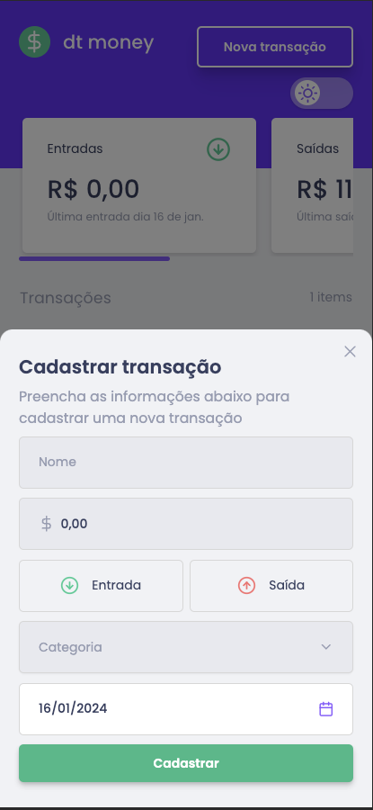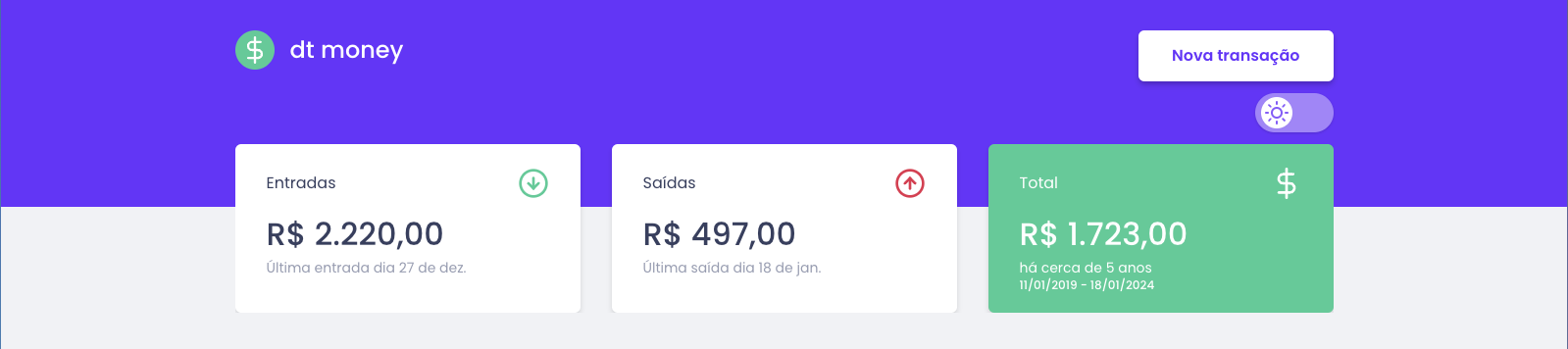 O projeto dtmoney é uma plataforma que cadastra transações, calcular o saldo, total de entradas e saídas, lista as transações e indica o período de tempo em que elas ocorreram.