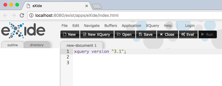 eXist is another open source XML database. The latest release is 3.4.0. If you are on a Mac, you can also install with Homebrew: brew cask install exist-db. When you run for eXist for the first time, you'll need to set configuration settings. We recommend that you accept the defaults for now. After eXist starts, navigate to eXide, its browser-based query executive engine.