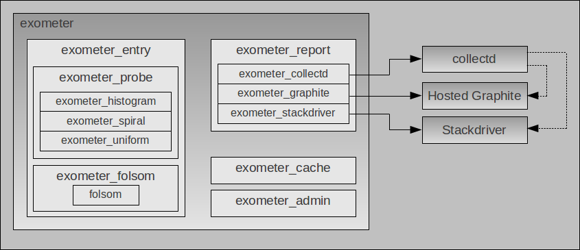 Exometer Core comes with a set of pre-defined monitor components, and can be expanded with custom components to handle new types of Metrics, as well as integration with additional external systems such as databases, load balancers, etc.