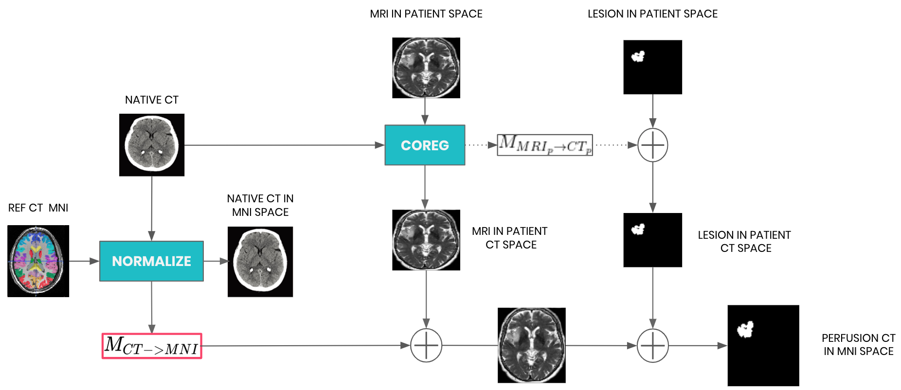 - Co-register T2-MRI sequences to non skull-stripped native CT sequences (as implemented by SPM12) and apply this transformation to the lesion labels [matlab/mri_coreg_normalisation_wrapper.m]