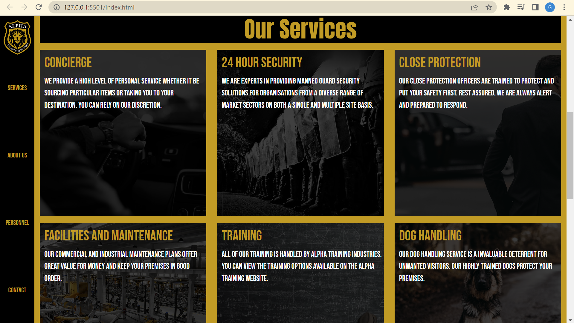This is a custom made template used for testing website designs for Alpha Security which is a security company based in Aylesbury. This was a scrapped template that was considered for publication and is not fully complete. Currently it is a static webiste just built in html files but if reconsidered it would be implemented using Angular framework and more changes would be added like extra pages and scroll animaions.