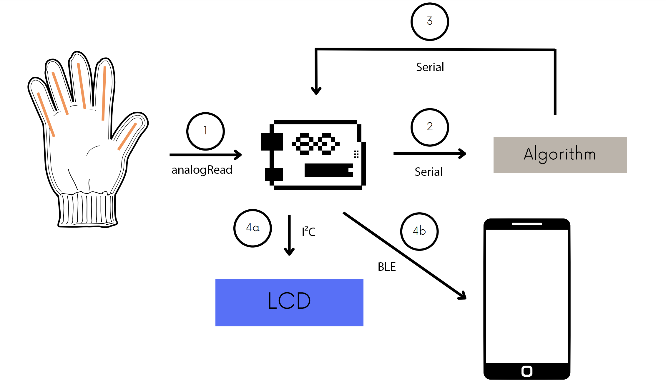 text through an on-glove LCD screen and a custom Bluetooth Low Energy App. This