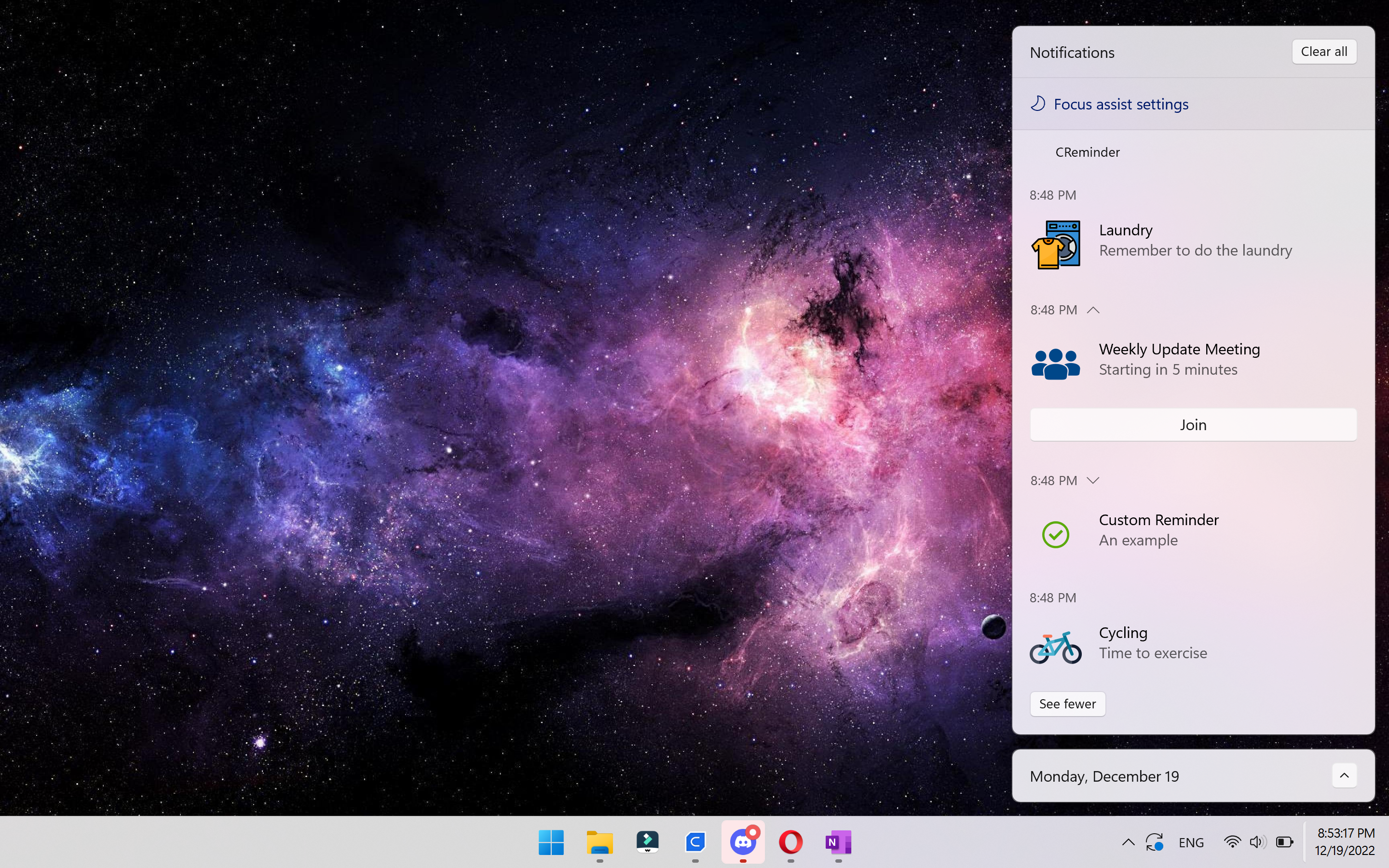 CReminders is a C++ and Python written program that runs in the background and lets you create custom reminders using Windows ToastNotifications (pop-ups). In addition to a custom title, message, days, and time, you can add an icon and a button for the notification.