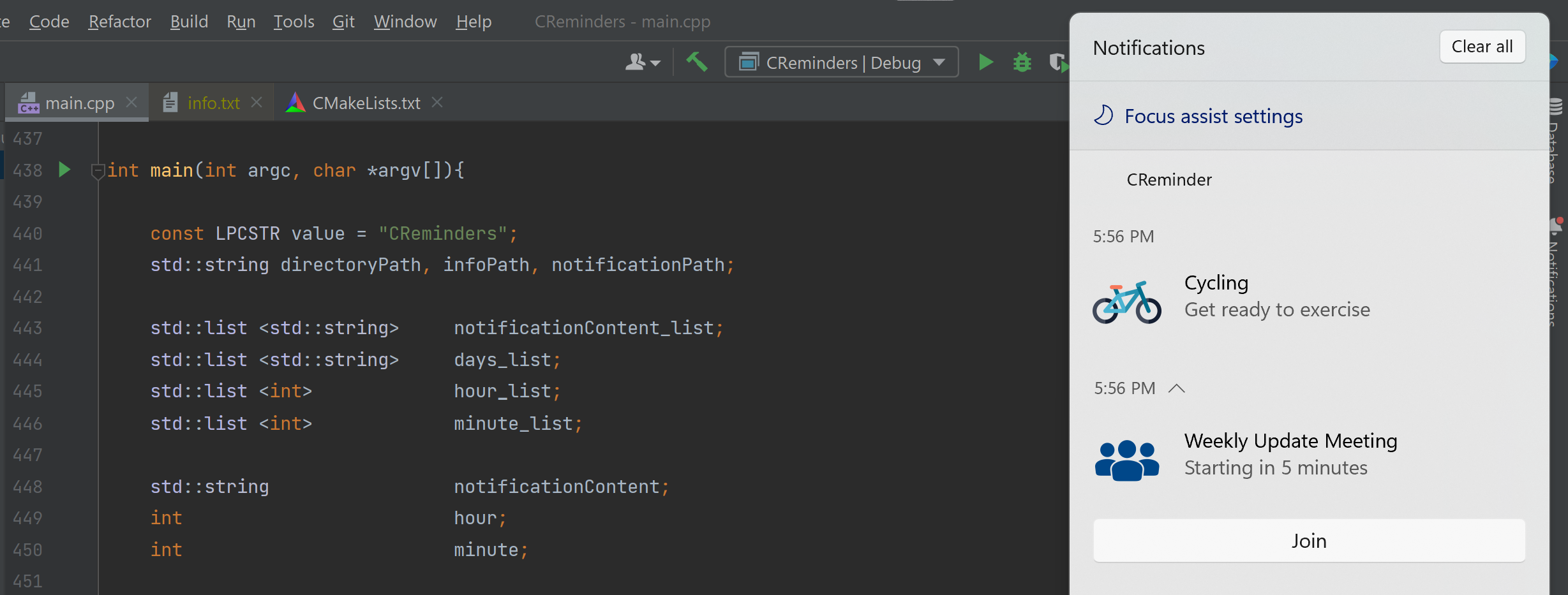 CReminders es un programa escrito en C++ y Python, el cual corre en segundo plano y te permite crear recordatorios personalizados usando notificaciones de Windows (pop-ups). Además de un título, mensaje, días, y hora personalizada, puedes agregar un icono y un boton para la notificación.