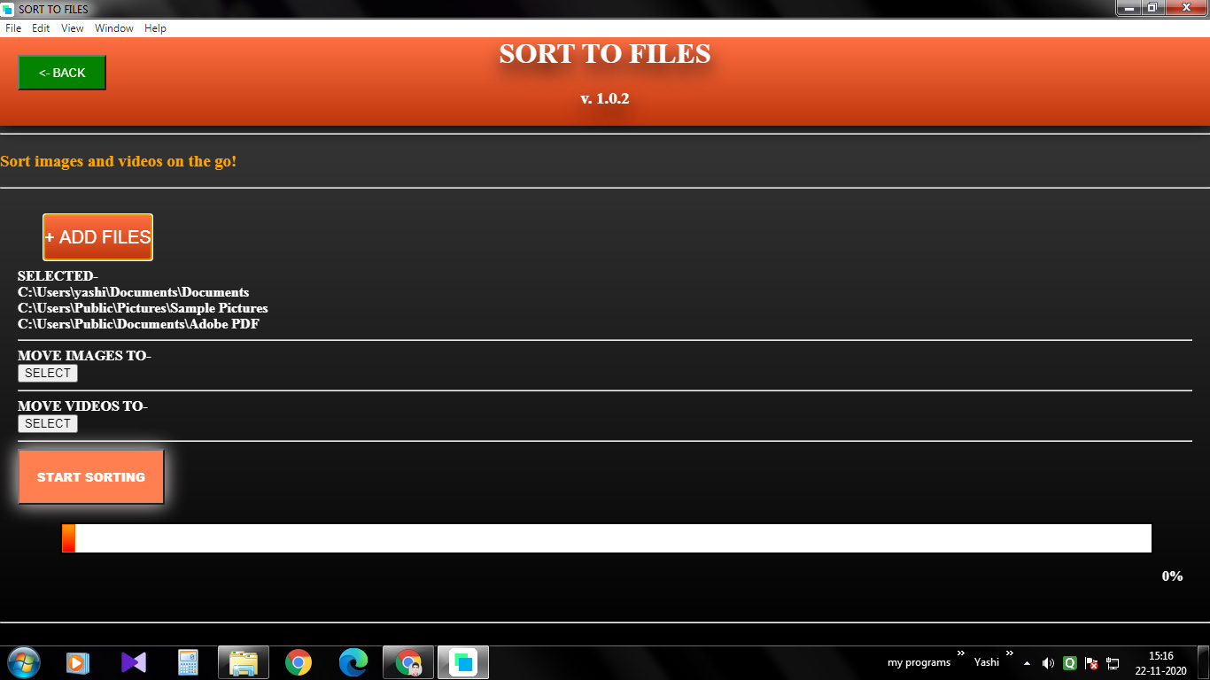images and videos and then click on start sorting. It will scan images from all the selected folders for images and videos, add them to an array and Sort them in separate selected folders.
