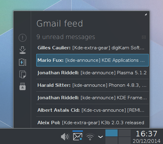 Ultimate Gmail Feed is a plasmoid for Plasma 5. It provides a list of your unread emails from your Gmail inbox. You also get notified when you receive new messages.