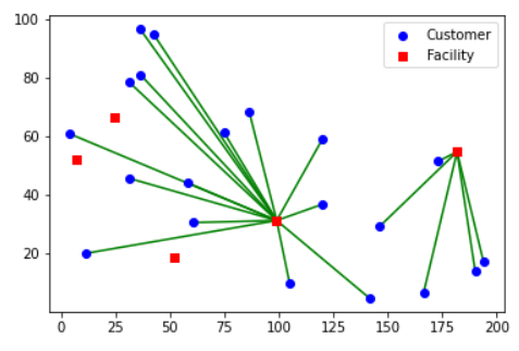 c = {(i, j): 1*np.hypot(xc[i]-xf[j], yc[i]-yf[j]) for (i, j) in A}