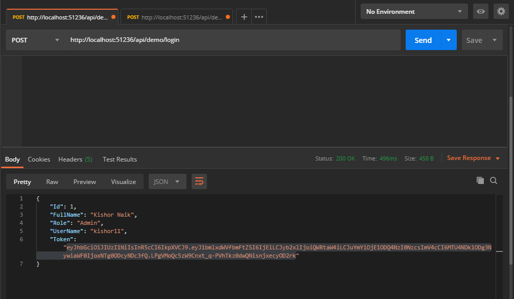 - Click the "Send" button, you should receive a "200 OK" response with the user details including a JWT token in the response body, make a copy of the token value because we'll be using it in the next step to make an authenticated request.