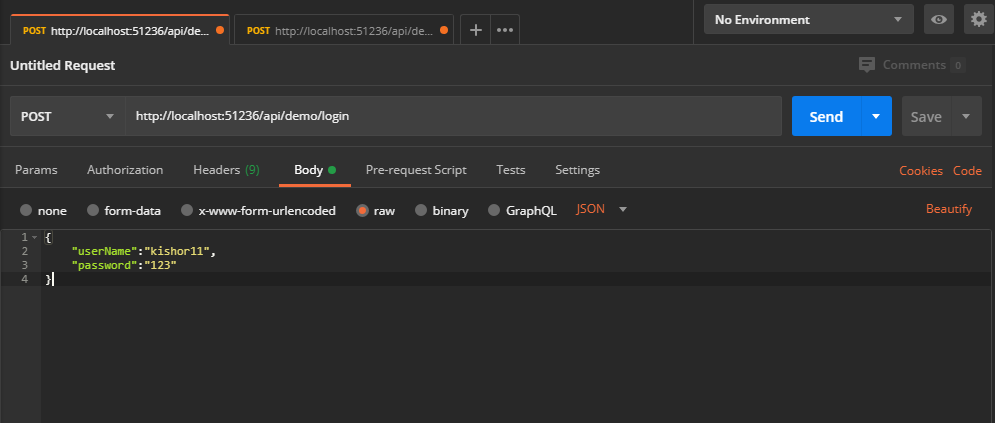 - In the URL field enter the address to the authenticate route of your local API : http://localhost:51236/api/demo/login