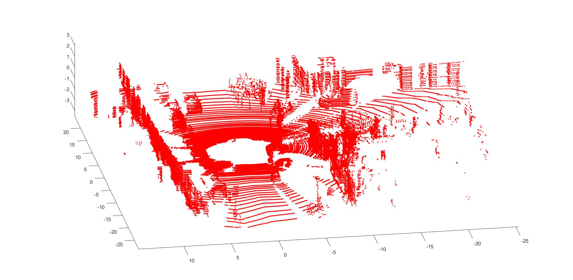 In this project, we are focusing on reading point cloud, camera image and calibration parameters from sample Kitti dataset [1] and create dense depth image for certain camera whose translation and rotations are known. Here is a view of the point cloud.