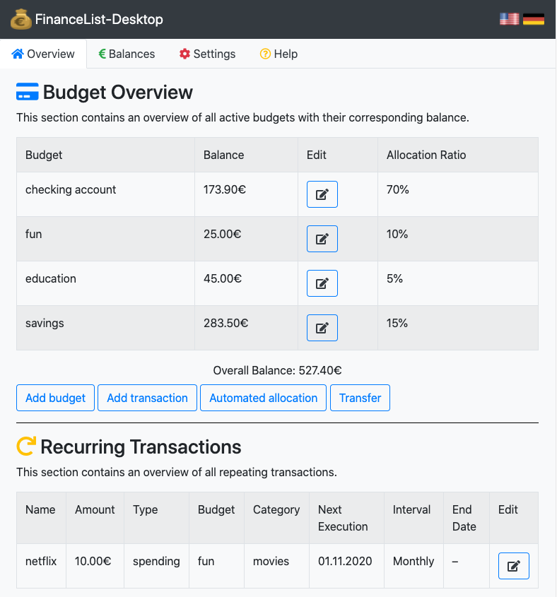 FinanceList-Desktop is a simple finance managing tool which works on Linux, macOS and Windows. It helps you to keep track of your expenses and allows you to manage your finances with ease. FinanceList-Desktop runs locally on your computer, i.e., all data is only stored on your computer and nowhere else.