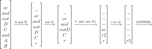 Firstly, the program transforms the query from it's infix form (as shown above) to a postfix form ( A B & C D ~ & | ) infix to postfix.
