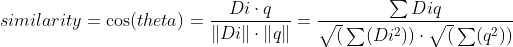 In this project the (vector-space)[https://en.wikipedia.org/wiki/Vector_space_model] model is used to decribe both the queries and the documents. The similarity between a document and a query is expressed by the the angle formed by the two but in practise it's much is easier to calculate the cosine of their angle. As all the documents will be in the first quarter of the cartesian axes (there cannot be a negative term in a document) the cosine will be positive and monotonically increasing which allow the usage of the cosine for the calculation of query-document similarity.