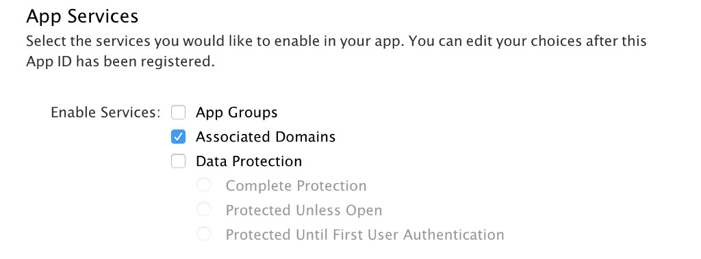 Application Servicessection of your App Identifier activateAssociated Domainsand save the changes.