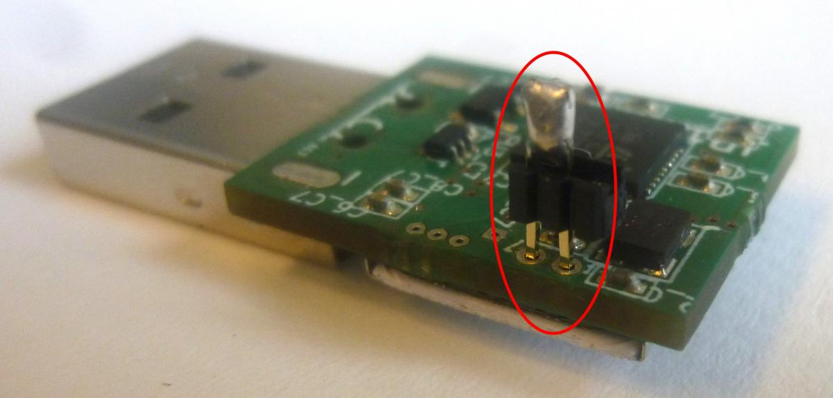 While the jumper is plugged in, connect the Nitrokey to the USB-serial adapter on your computer. The jumper is only required during the first moment of connection and can be removed afterwards.