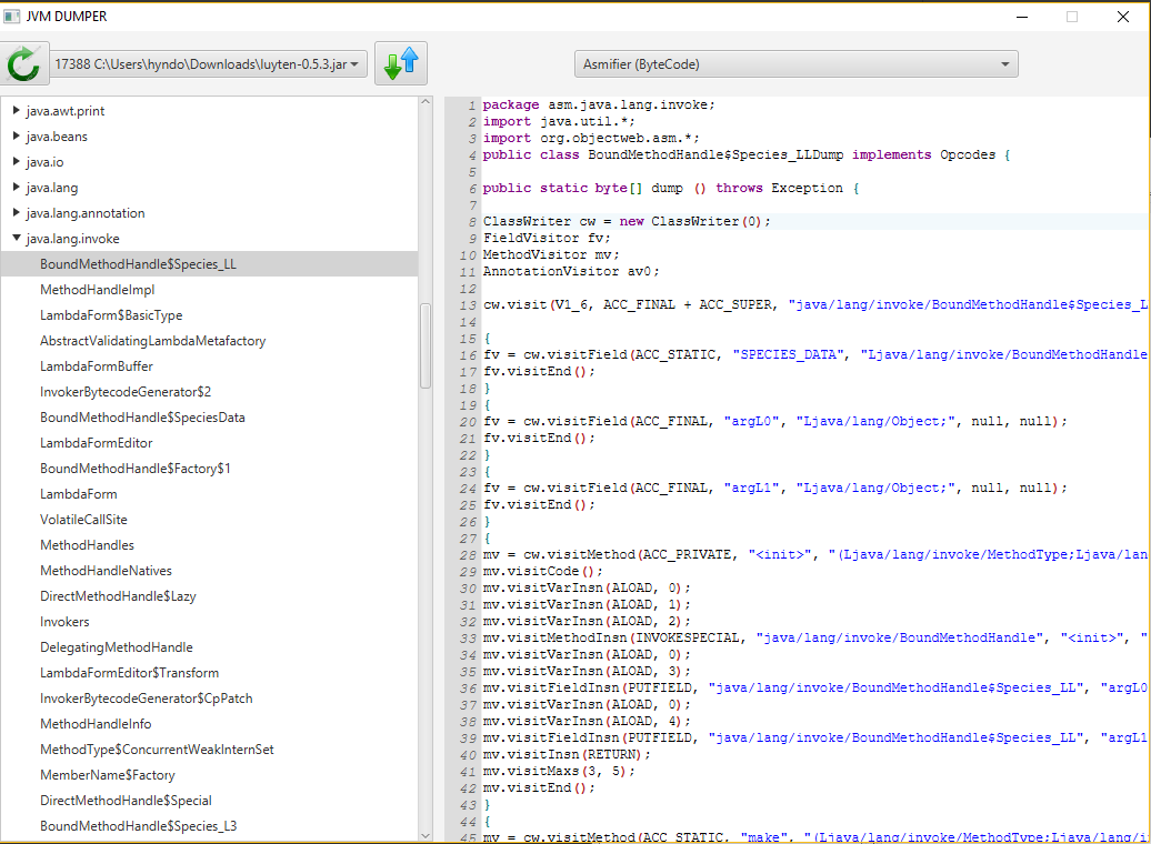 Attach to any java proccess and inspect any loaded class with three built-in modes: FernFlower decompiler, Asmifier (ByteCode), RawByteCode Mode