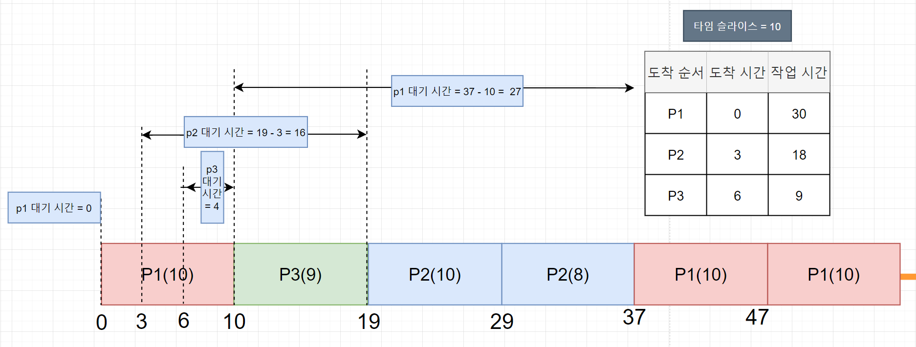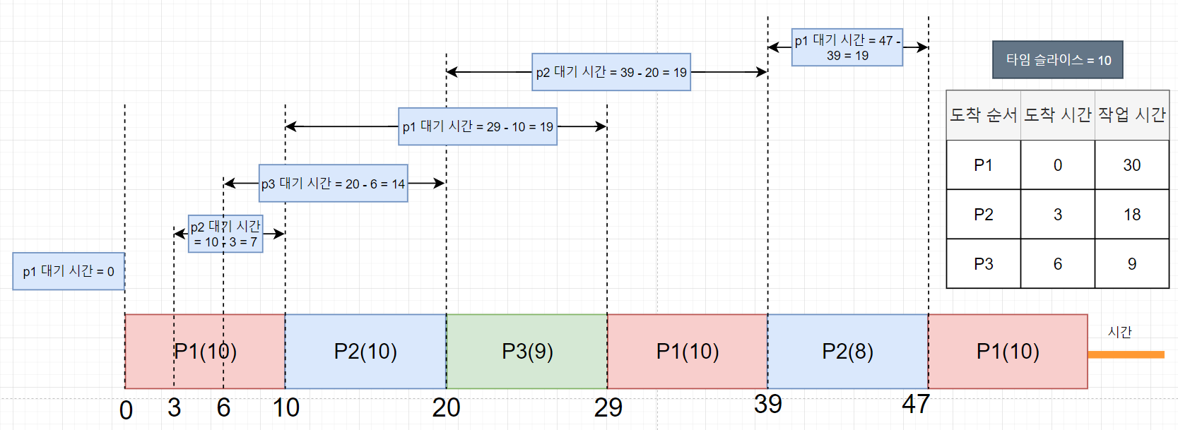 💡 실행중인 프로세스를 알고리즘에 의해 중단시키고 다른 프로세스에 CPU 소유권을 할당시키는 방식라운드 로빈