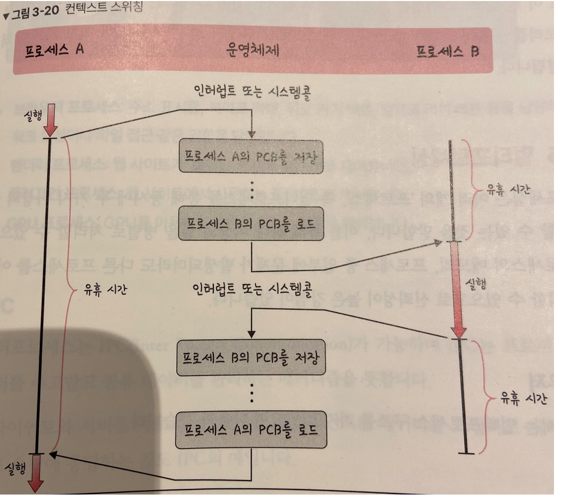 프로세스 A 실행하다 멈춤 → A의 PCB를 저장 → 프로세스 B를 로드하여 실행 → B의 PCB를 저장하고 프로세스 A의 PCB를 로드함