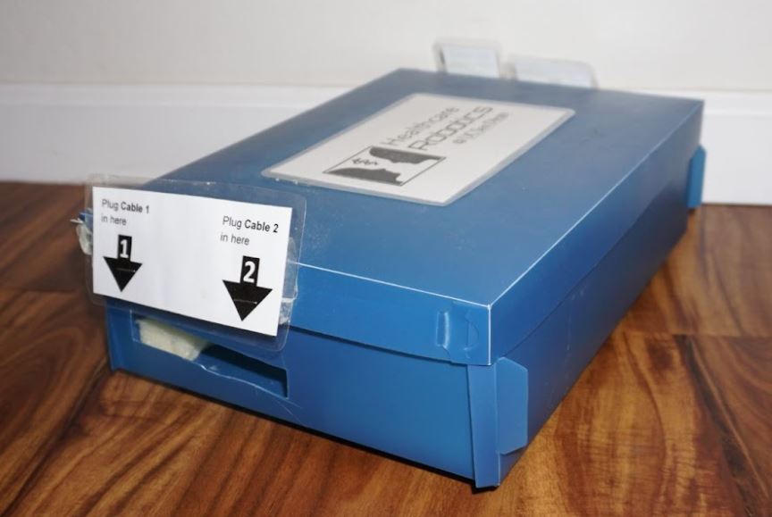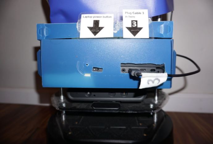 Fig. 4 The plastic resin box we used to house the laptop. Laminated cards instructed clinicians where to plug things in.