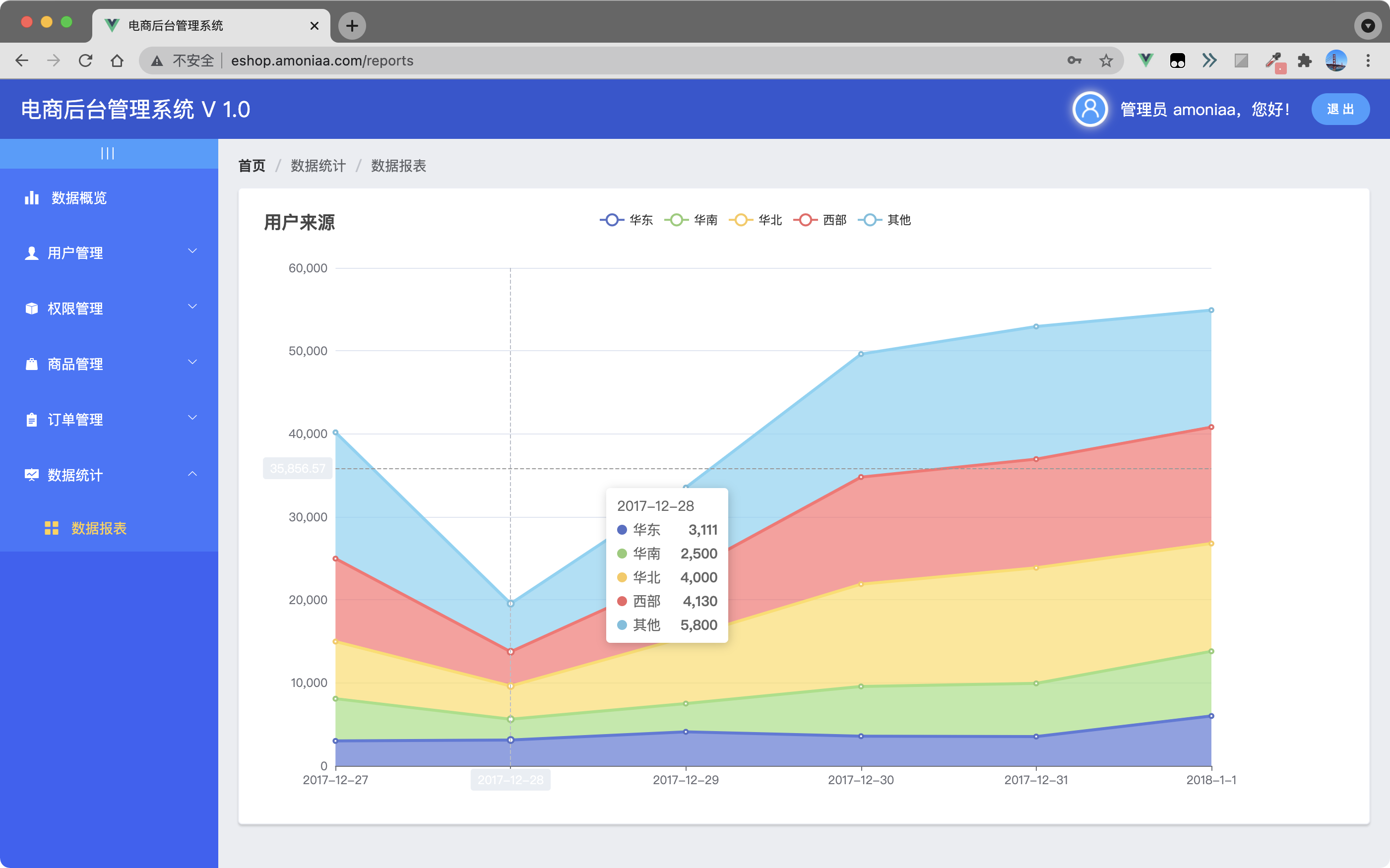 数据统计模块主要用于统计电商平台运营过程的中的各种统计数据,并通过直观的可视化方式展示出来,方便相关 运营和管理人员查看。