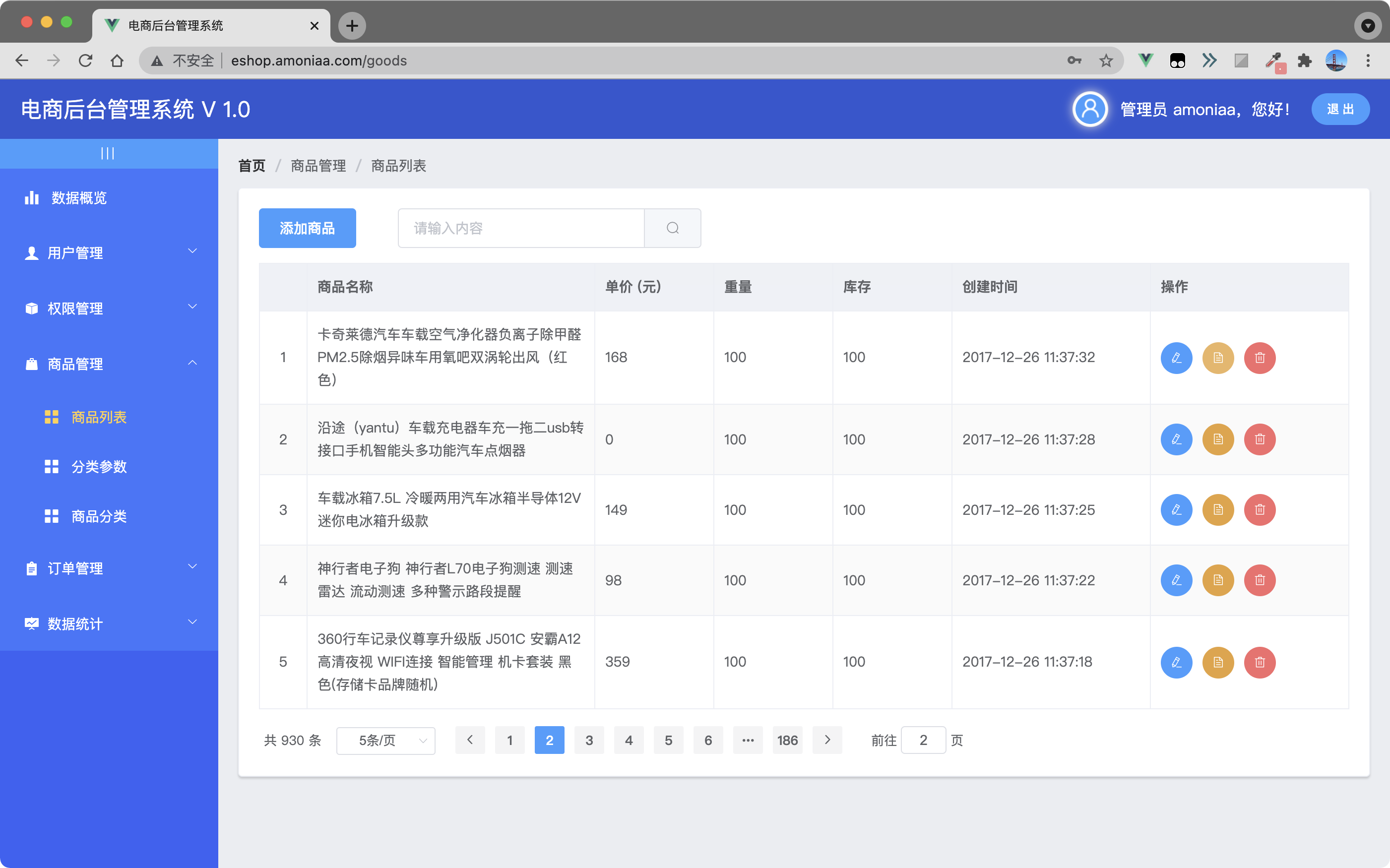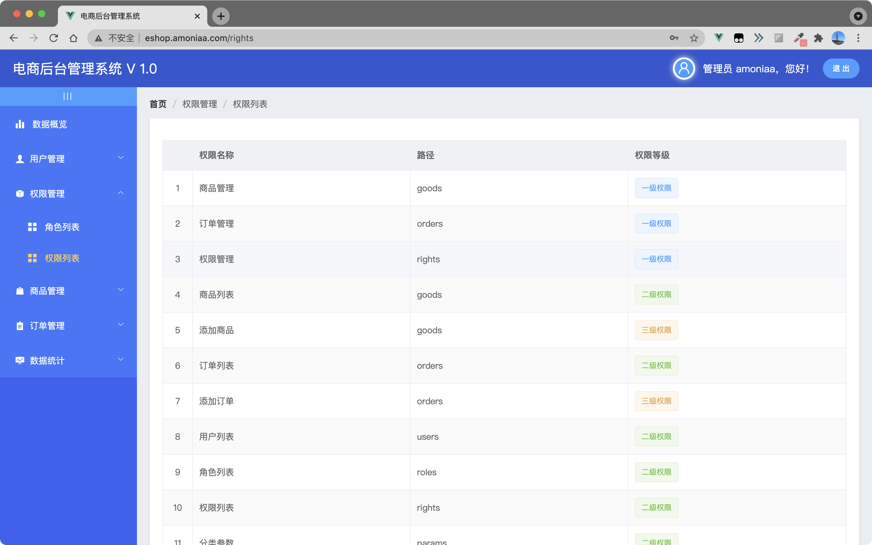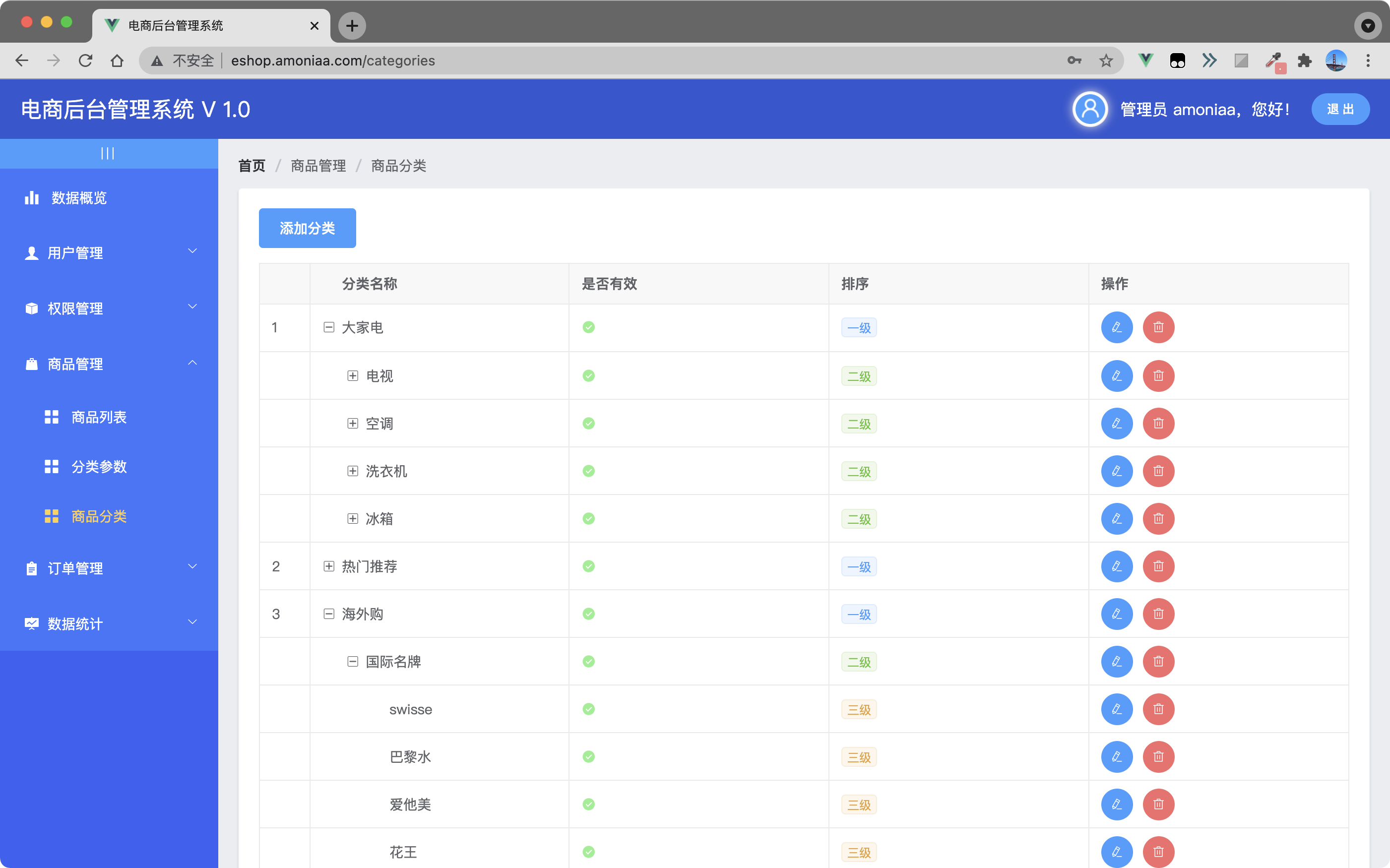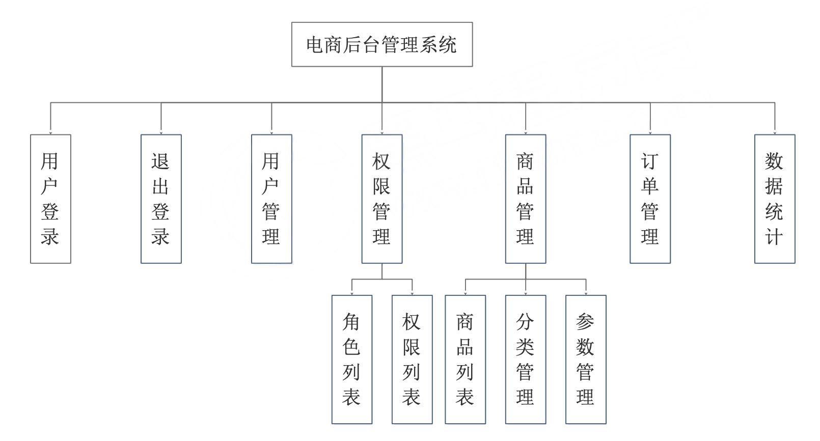 电商后台管理系统具有管理用户账号、商品分类、商品信息、订单、数据统计等业务功能。