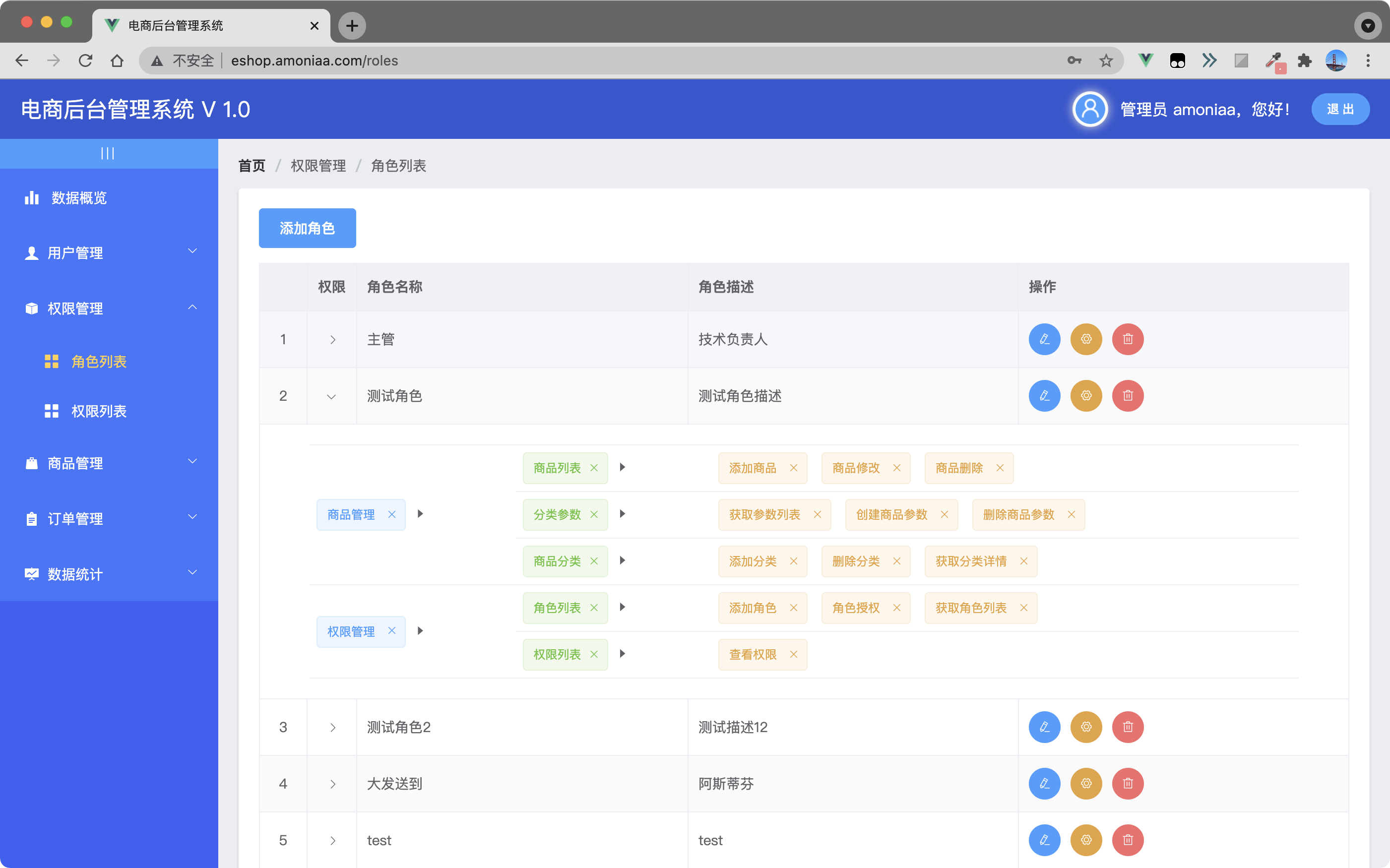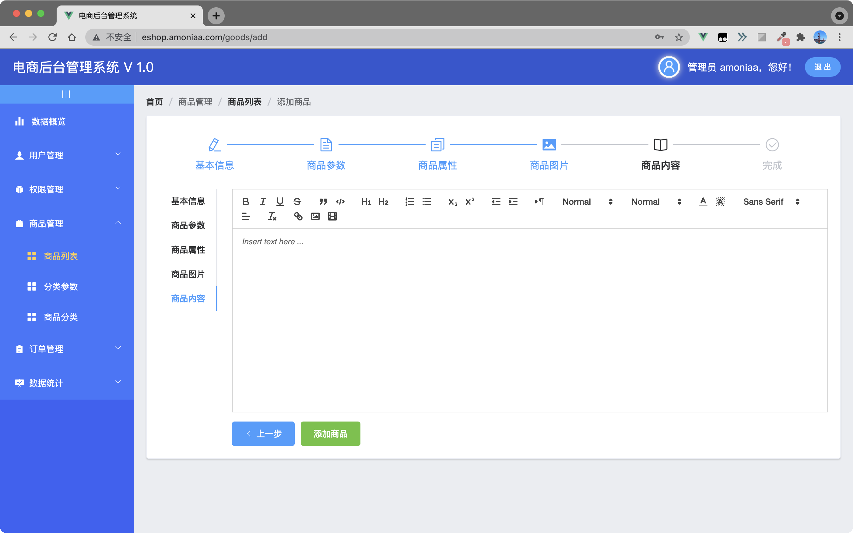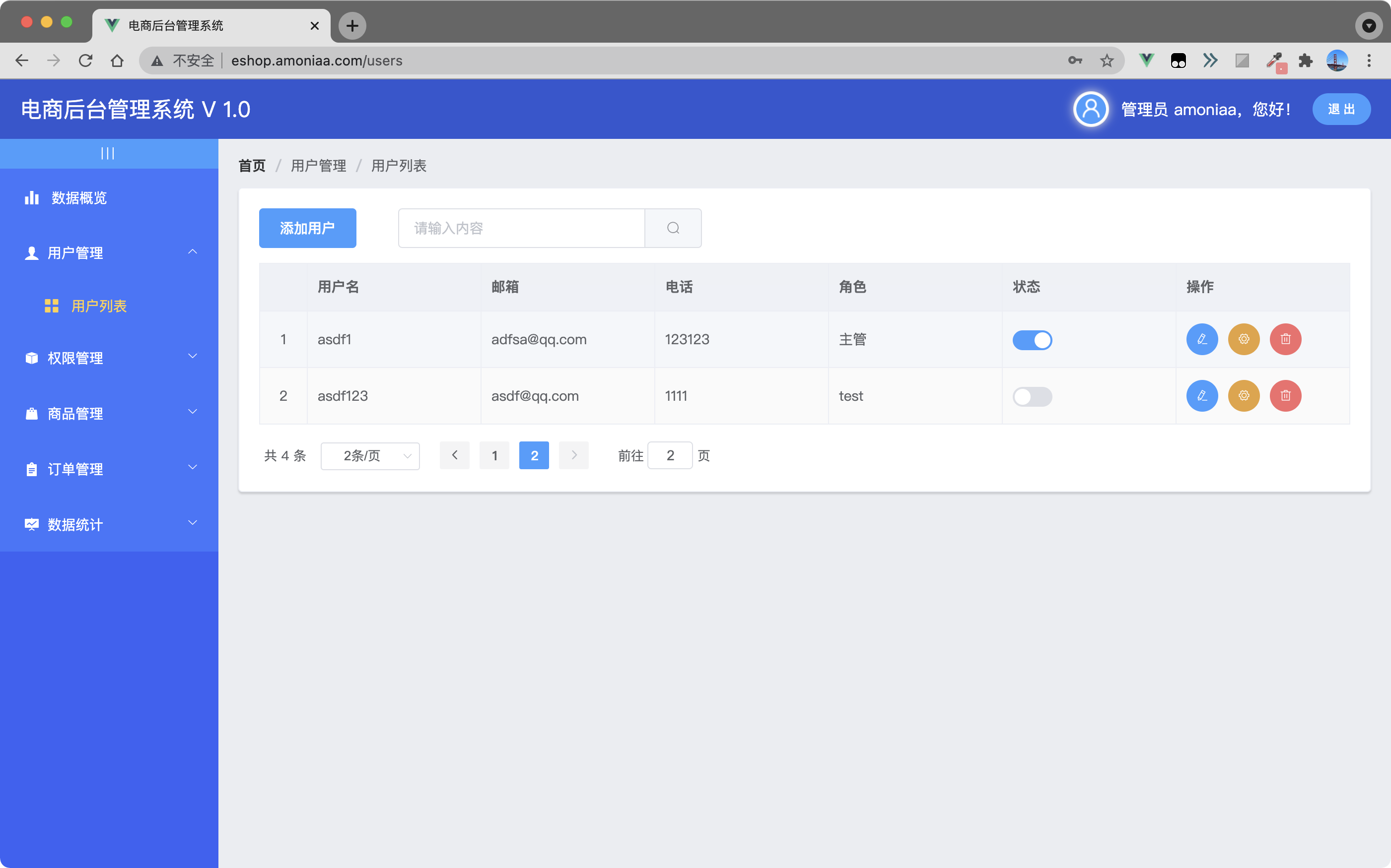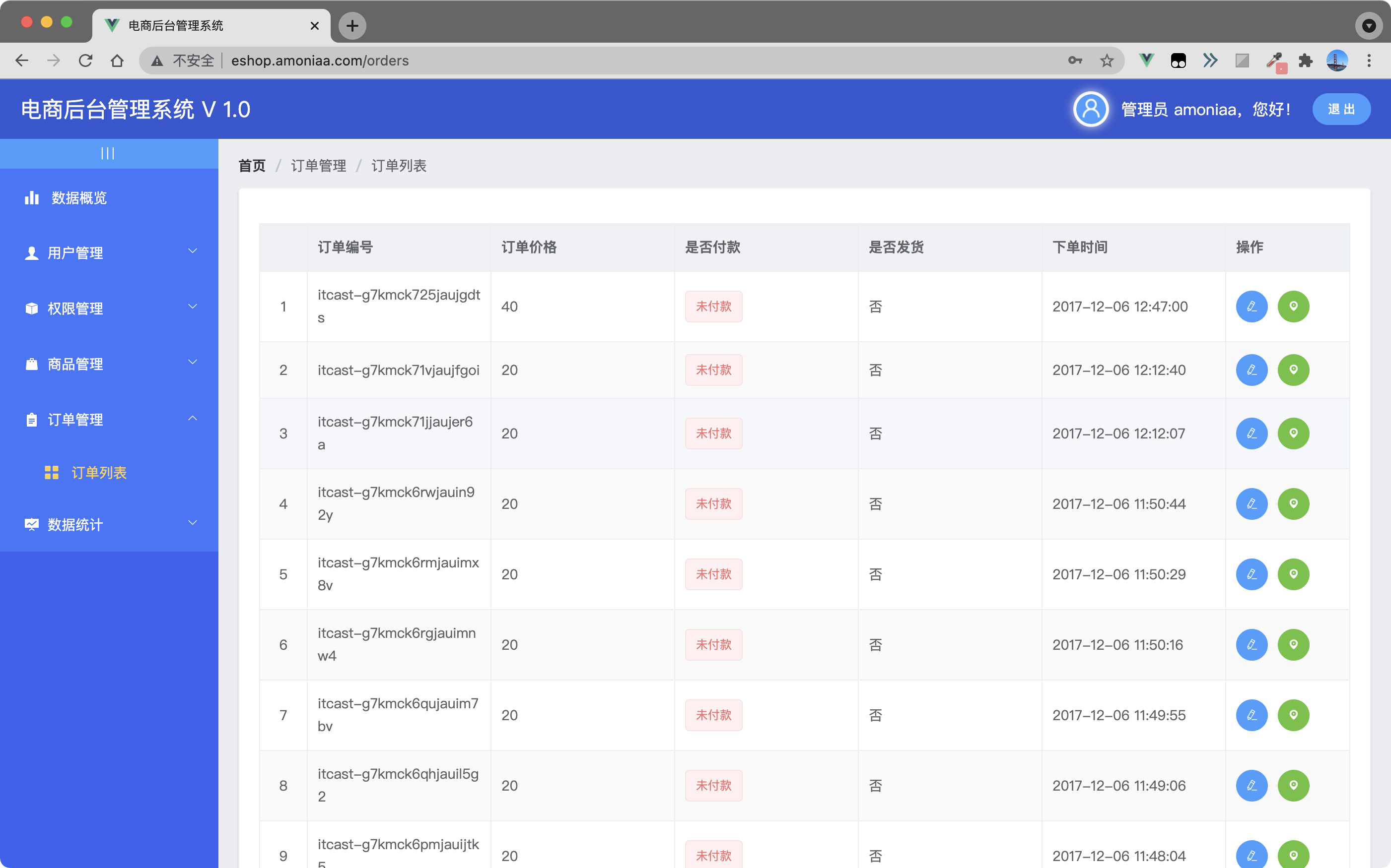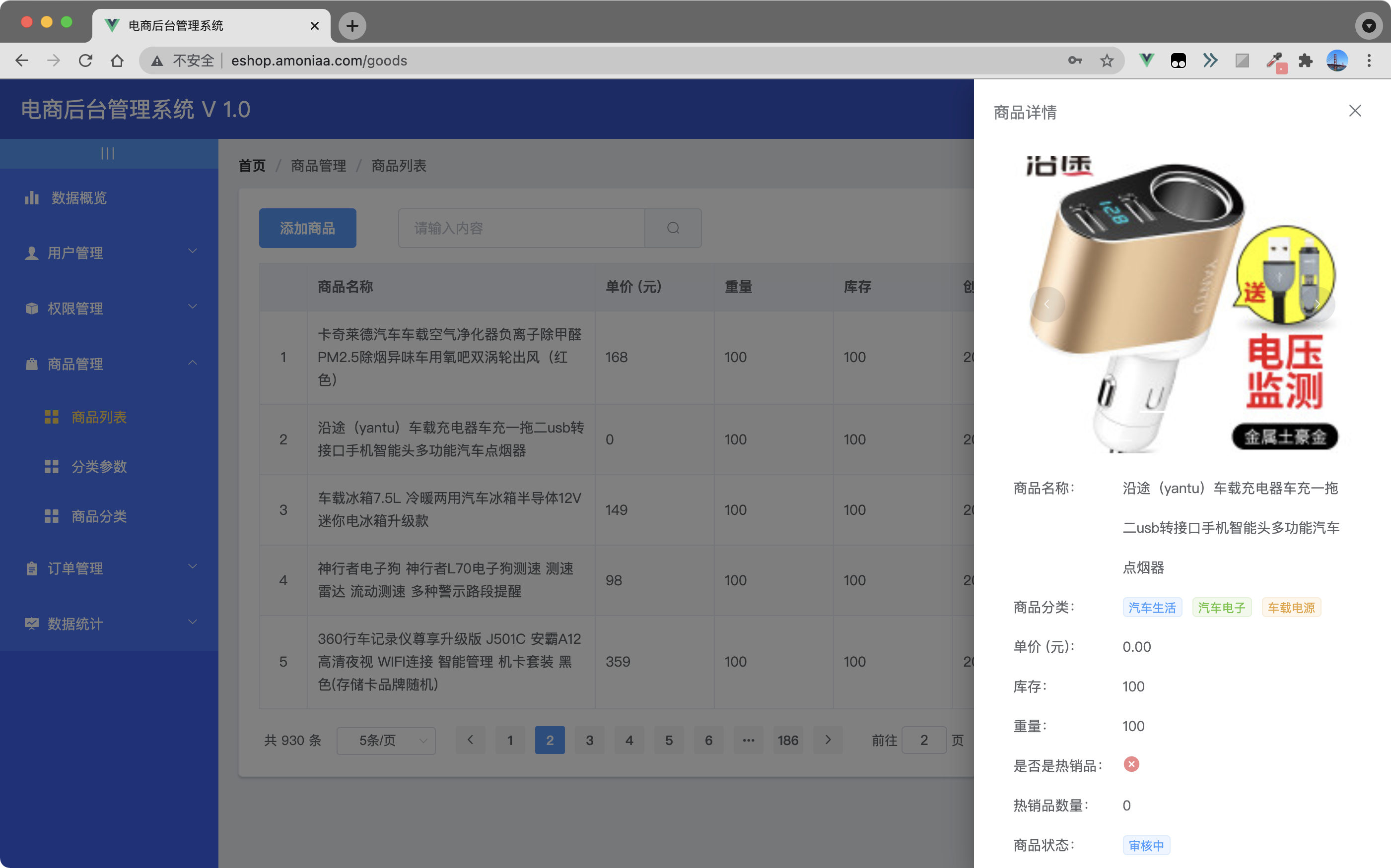 电商后台管理系统具有管理用户账号、商品分类、商品信息、订单、数据统计等业务功能。