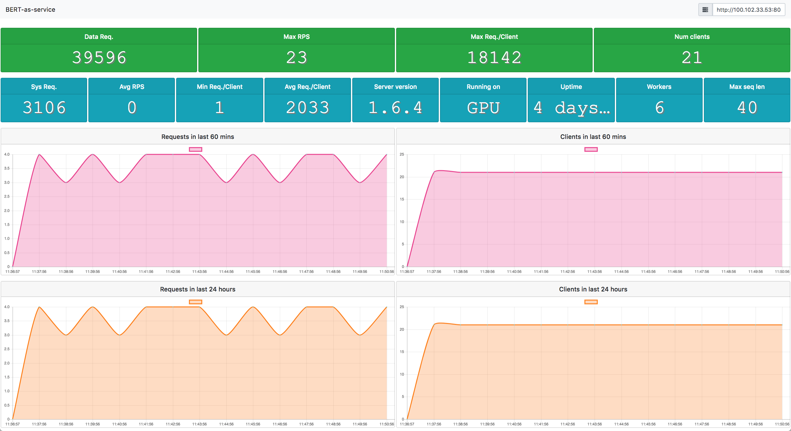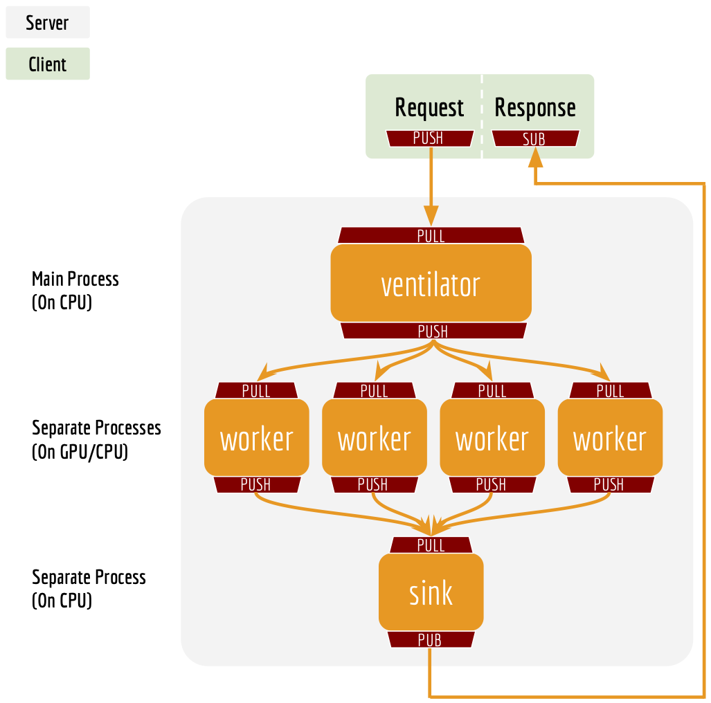This will start a service with four workers, meaning that it can handle up to four concurrent requests. More concurrent requests will be queued in a load balancer. Details can be found in our FAQ and the benchmark on number of clients.