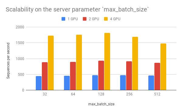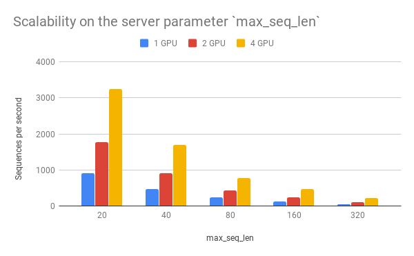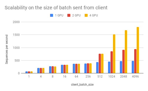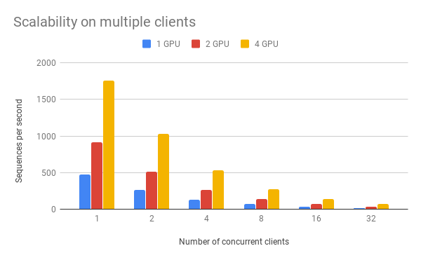 As one can observe, 1 clients 1 GPU = 381 seqs/s, 2 clients 2 GPU 402 seqs/s, 4 clients 4 GPU 413 seqs/s. This shows the efficiency of our parallel pipeline and job scheduling, as the service can leverage the GPU time more exhaustively as concurrent requests increase.
