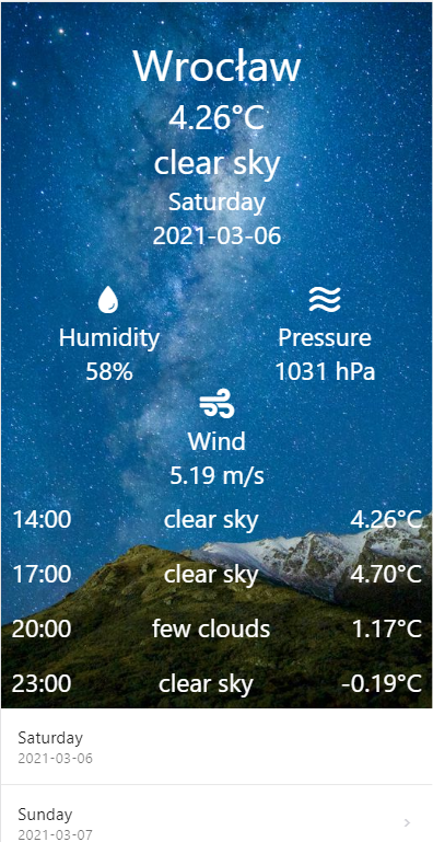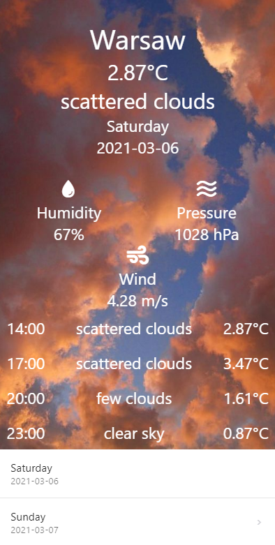 Mobile application developed with React Native and free OpenWeather API (https://openweathermap.org/forecast5)