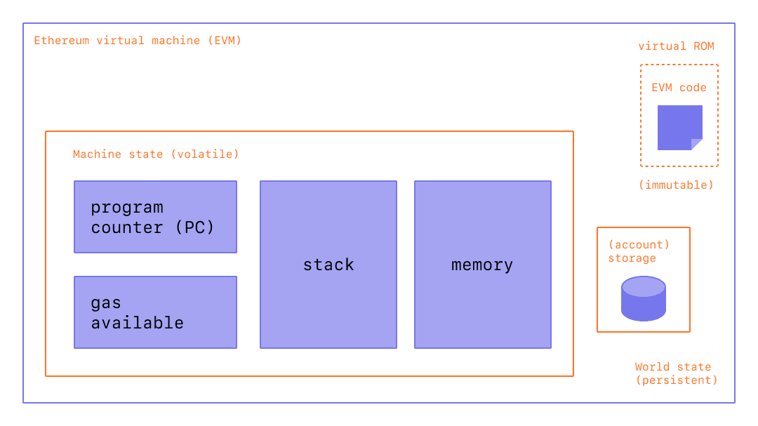 Compiled smart contract bytecode executes as a number of EVM opcodes, which perform standard stack operations like XOR, AND, ADD, SUB, etc. The EVM also implements a number of blockchain-specific stack operations, such as ADDRESS, BALANCE, KECCAK256, BLOCKHASH, etc.