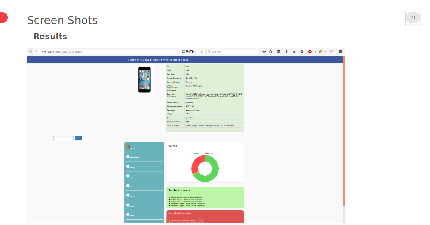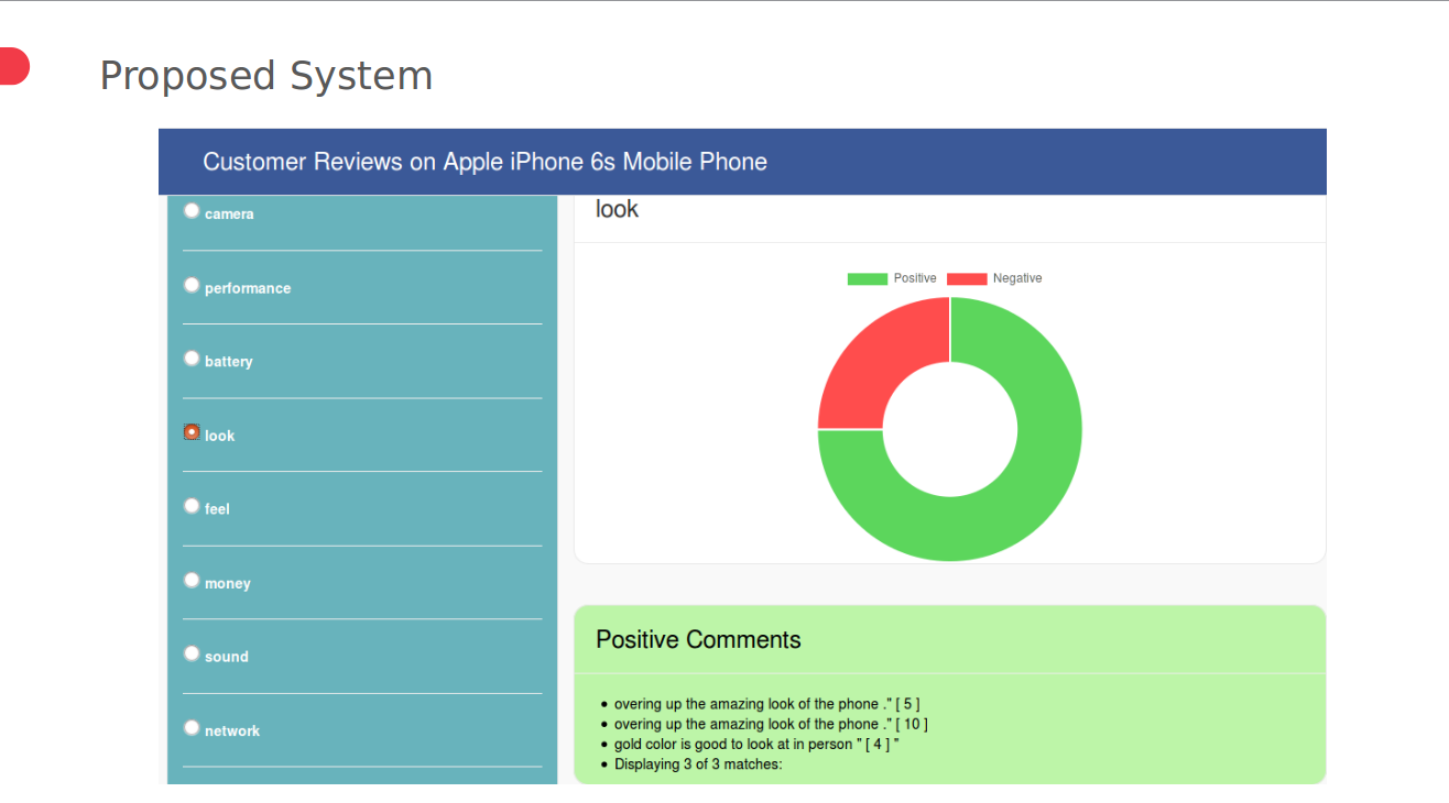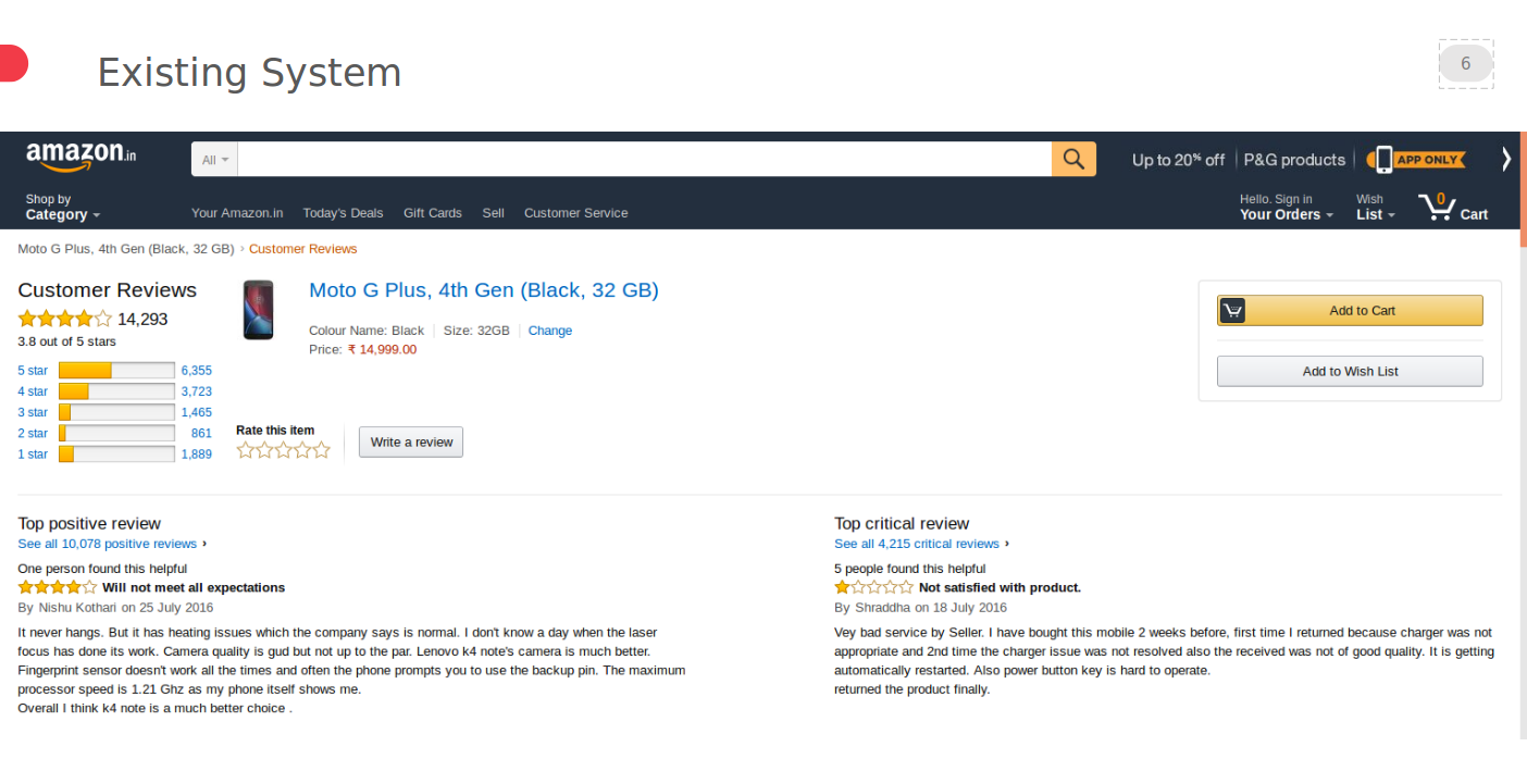 The existing system shows top positive and negative reviews, but these are of overall product. We still need to search for the specific feature we are looking for in the product, for example, if we are looking for a mobile which has good camera, but the mobile is rated bad due to its battery problem. There is no simple way to identify this, unless we manually read the reviews.