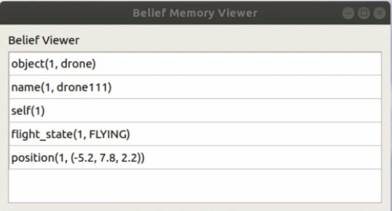 Aerostack stores the set of beliefs and tries to keep their consistency with the world and with the other beliefs. Aerostack represents beliefs using a logic-based approach with predicates. Next table shows examples of such predicates with the general format of predicate(object, value) or simpler forms such as property(object). These predicates are present in the memory with their corresponding values: