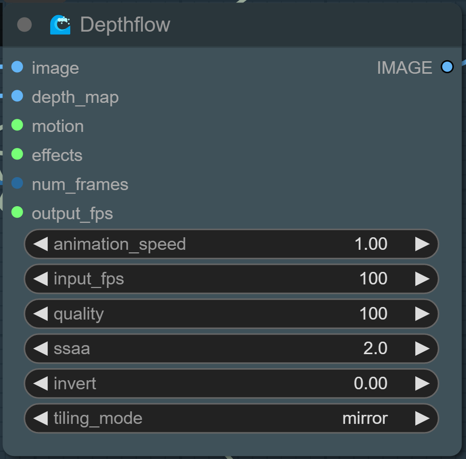 image: Input image or image batch.depth_map: Depthmap image or image batch corresponding to the input image.motion: Depthflow motion object(s) for configuring animation.effects: (Optional) Depthflow Effects including DOF and Vignette that can be stacked.num_frames: Number of frames in the animation.input_fps: Frames per second for the input.output_fps: Frames per second for the output video.quality: Output quality (1-100)ssaa: Super sampling anti-aliasing samples (0.0-2.0)invert: Invert the depthmap.tiling_mode: Control for tiling the image.