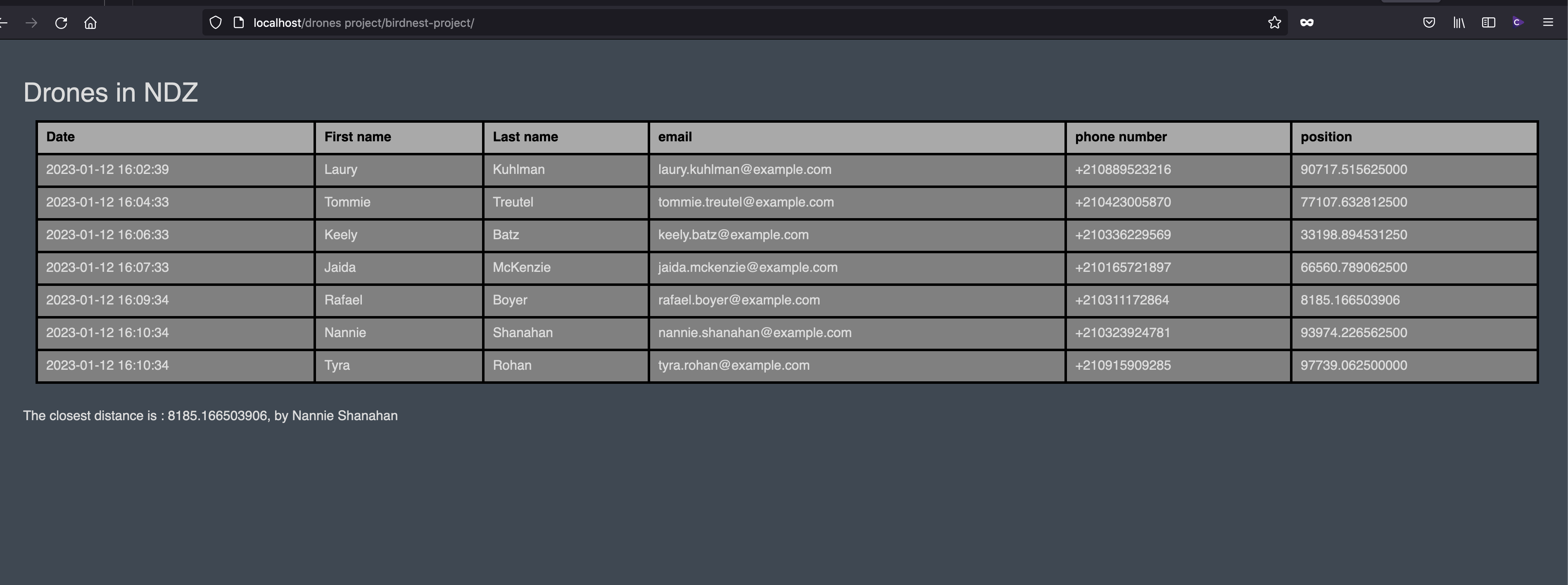 The aim of this project is to create a web app to list all the drone pilots that violated the NDZ perimeter around the nest of the endangered bird Monadikuikka. The area within 100 meters of the nest is declared as NDZ.