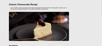 Recipe Page Solution for a challenge from Devchallenges.io. Demo | Solution | Challenge Table of Contents Overview Built With Features How to use Contact Acknowledgements Overview Built With html css Features This application/site was created as a submission to a DevChallenges challenge. Acknowledgements Steps to replicate a design with only HTML and CSS Node.js Marked - a markdown parser Contact Website your-website.com GitHub @your-username Twitter @your-twitter