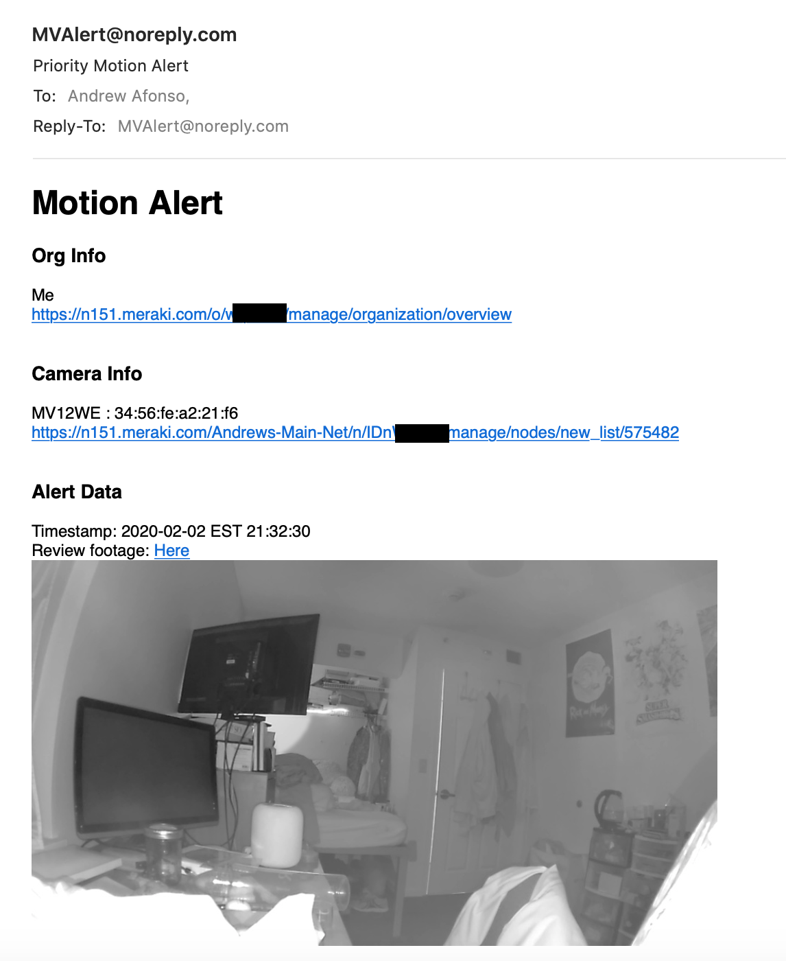 I use my Meraki MV cameras to monitor the entrance of my apartment. The Meraki Dashboard offers the ability to schedule times during which detected motion will generate alerts, but with 3 roommates and being in college, there’s no real schedule that would provide more meaningful filter motion alerts.