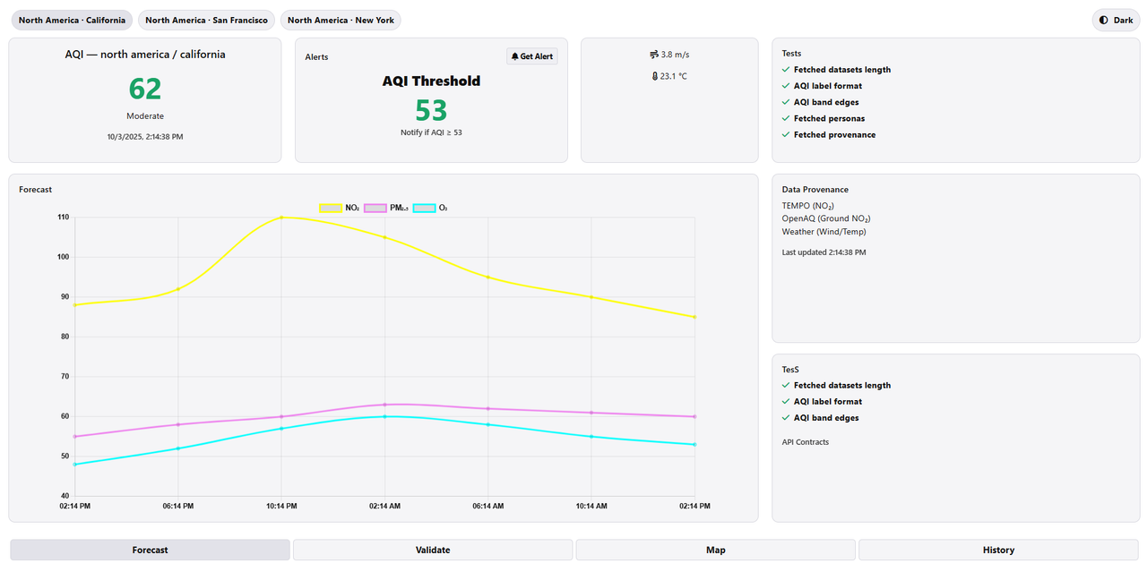 This project integrates NASA TEMPO satellite data, OpenAQ ground measurements, and Open-Meteo weather into a unified API. It processes data into CSV files, provides forecasts, and exposes a FastAPI service with health & metrics endpoints.