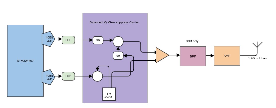 The board will be drivin from a STM32F407 microcontroller which will produce the IQ modulation. (AFSK FM and SSB)