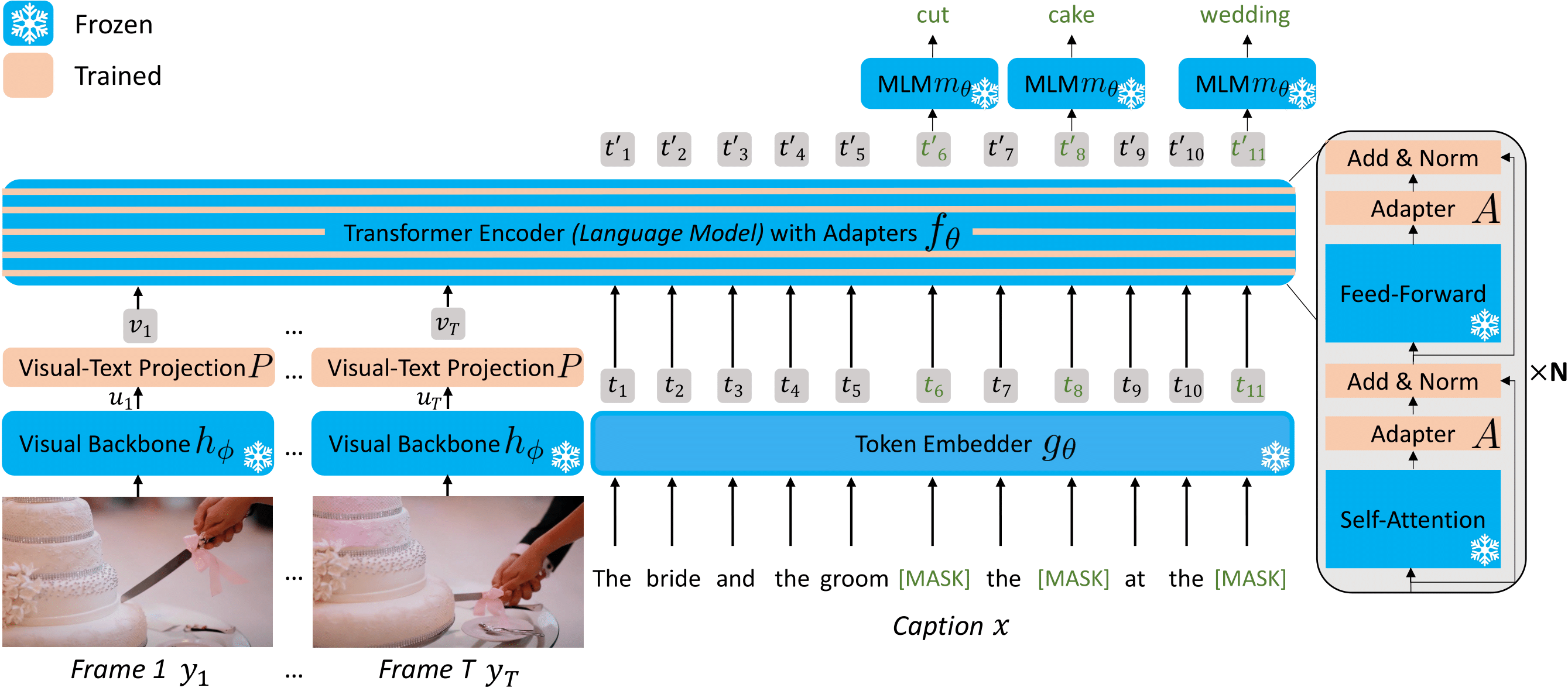 Based on the previous command: - Variant without adapters: Pass `--lr=3e-4 --ds_factor_ff=0 --ds_factor_attn=0` - UnFrozenBiLM variant: Pass `--lr=1e-5 --ft_lm --ft_mlm --ds_factor_ff=0 --ds_factor_attn=0 --batch_size=8` - UnFrozenBiLM variant with no language initialization: Pass `-lr=1e-5 --ft_lm --ft_mlm --scratch --ds_factor_ff=0 --ds_factor_attn=0 --batch_size=8` - Other language models: Pass `--model_name=bert-large-uncased` or `--model_name=bert-base-uncased` to use BERT-Base or BERT-Large instead of Deberta-V2-XLarge - Train on a subpart of WebVid10M: Sample a random subpart of the train dataframe file and change the `--webvid_train_csv_path`. The random subsets used in the paper will be released soon.Click for details...