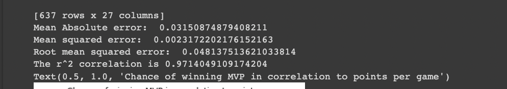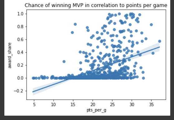 Rather this model allows us to infer that MVP is purely based on an individual player's performance rather than team performance. Graph of player's points per game and likelihoodof winning MVP shows strong positive correlation. Logistic regression model demonstrated poor correlations and statistics, indicating it is incorrect choice of prediction.