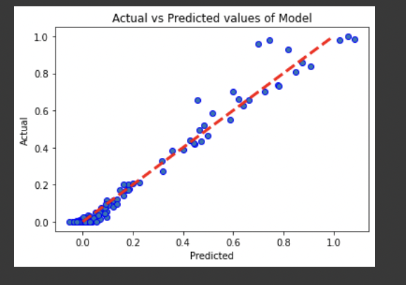 Various statistical tests including R^2, MSE, RMS demonstrate error rate < 4%. Strong R^2 value .97 close to 1. Graph of actual and predicted values of MVP voting points is very similar, with most predicted values lying on actual values line.