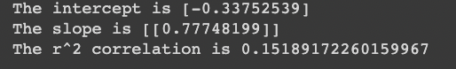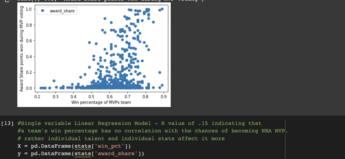 Single variable linear regression. Asseses how the win percentage of a candidate's team determines their chance of winning MVP. Poor r^2 value of .15 demonstrates no correlation. Scatter plot also demonstrates points all over the place with no line of best fit.