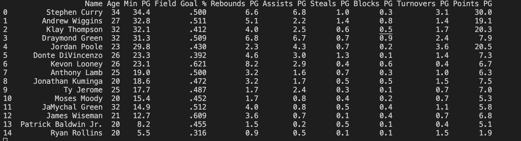 Scraped Golden State Warrior's page on basketballreference.com and extracted roaster stats through python's beatiful soup library.