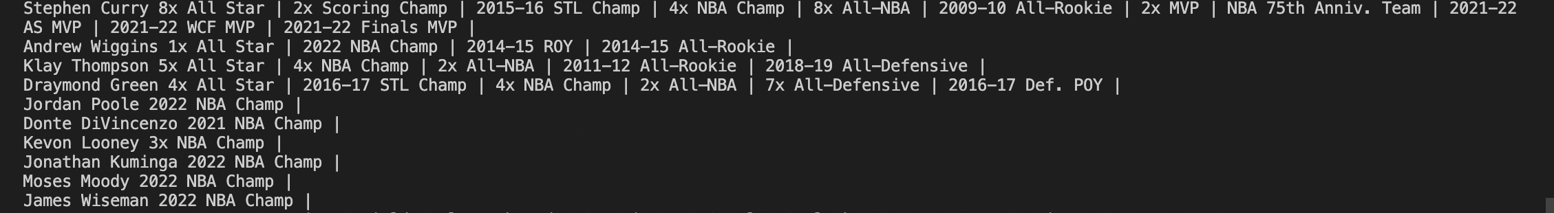 Iteratively extracted players individual person achievements by scraping their personal websites through URL data concatenation. Derived every warrior's player's achievement during their career. Also scraped personal demographic data such as height, weight, twitter handle, etc by iteratively scraping. Get_stats function on index.py provides every players data from 1991-2021 when a year in inputted.